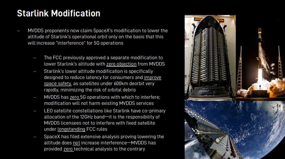 为反驳这个观点,SpaceX 向 FCC 表示,目前 MVDDS 联盟没有任何 Starlink 规格更变会导致干扰地面 5G 业务的证据。在会议中,该公司声称,保护非地球静止固定卫星服务(NGSO FSS)卫星服务运营商免受其地面 5G 服务可能造成的任何干扰是联盟的责任, e-CFR(联邦法规电子代码)强调了这一义务。