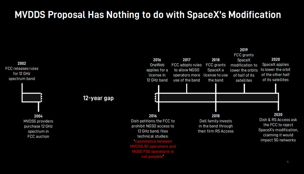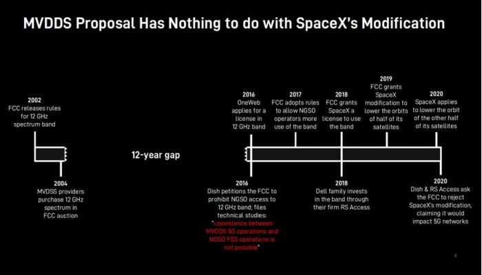 不过在推进过程中遭到了种种困难,尤其是 SpaceX 和那些反对 MVDDS(多频道视频和数据分发)联盟的非 MVDDS 电信服务提供商之间产生了摩擦。不过这个事情在今年早些时候出现了转机,当时 SpaceX 向美国联邦通信委员会(FCC)提交请求,希望降低目前在轨的 Starlink 卫星的运行高度。MVDDS 联盟认为更低的轨道,再通过 12GHz 频谱进行传输会给地面的 5G 运营产生影响。