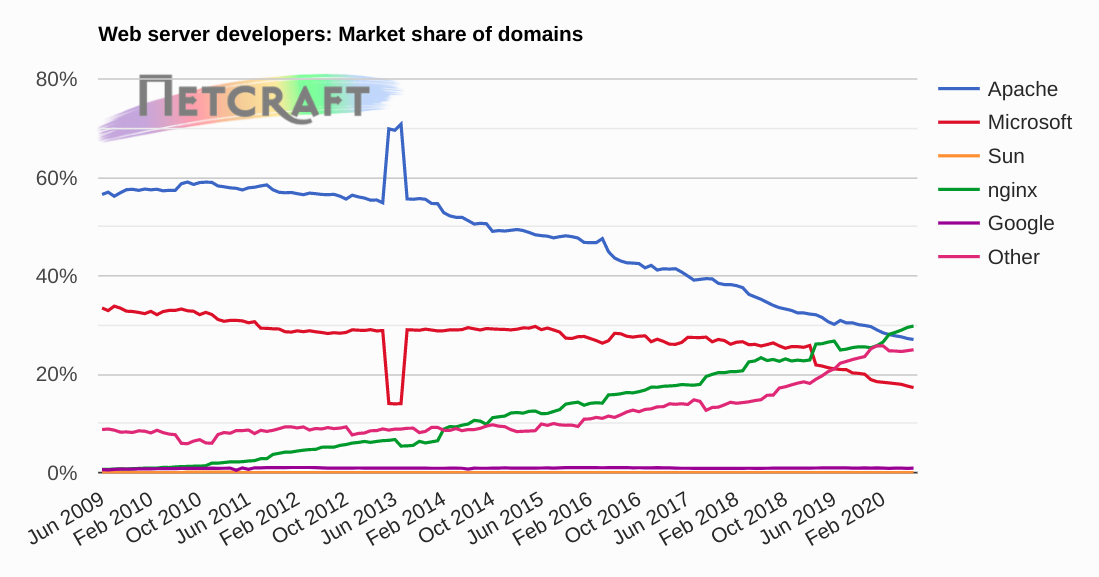 nginx 在域名方面增长最明显,共涨了 200,000,微软丢失了 110 万个域,Apache 丢失了 99.8 万,也使得 nginx 在该指标上的领先地位更进一点加强,现在它已经拥有约 3000 万个域,占有 29.8%(+0.27 pp)的市场份额。