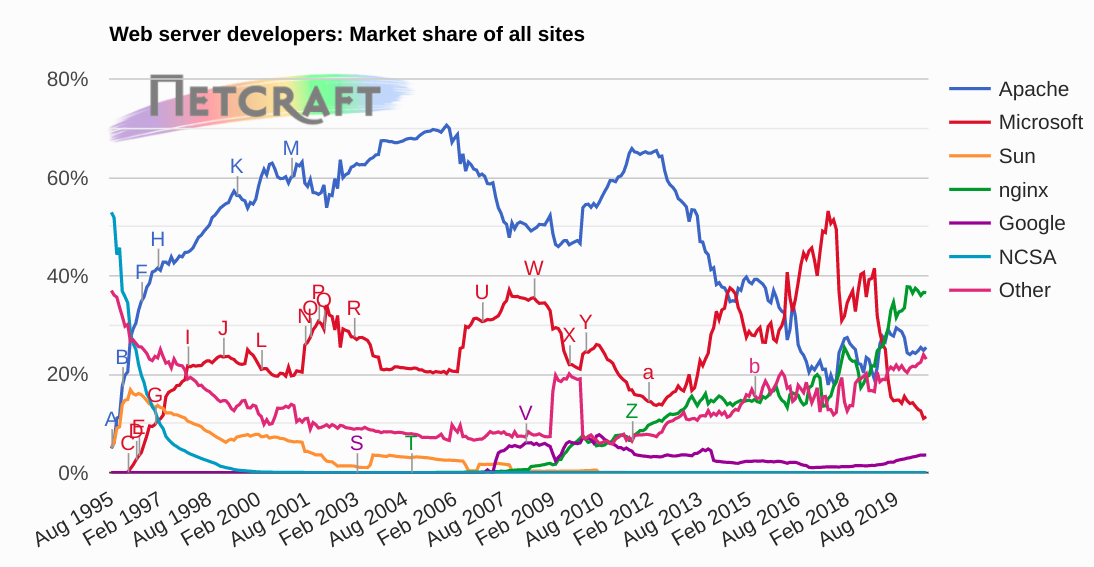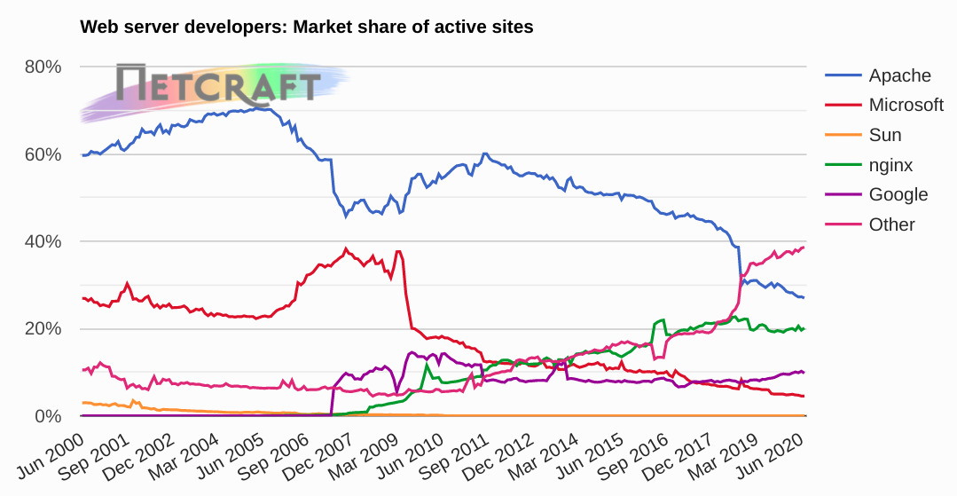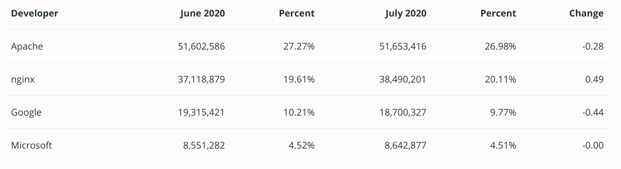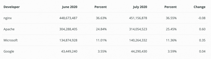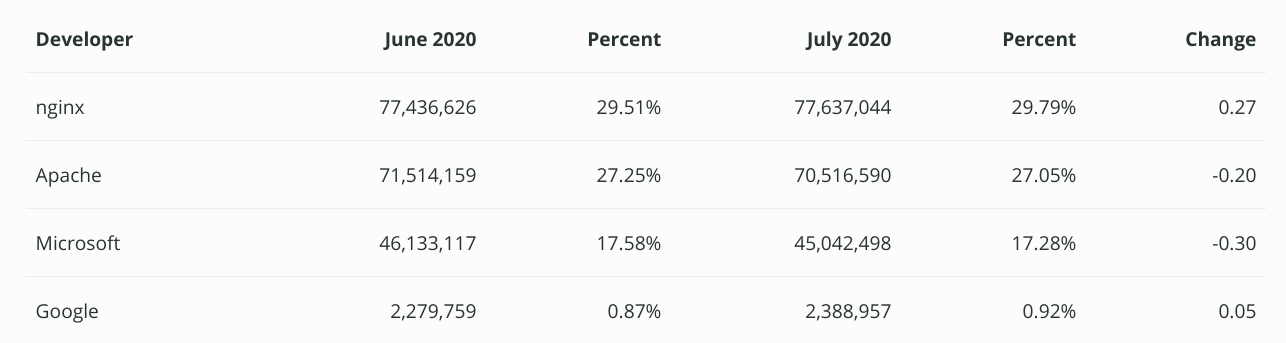 Netcraft 公司官网每月公布的全球 Web 服务器调查报告“Web Server Survey”是当前人们了解全球网站数量以及服务器市场分额情况的主要参考依据,2020 年 7 月份的报告目前已经发布。