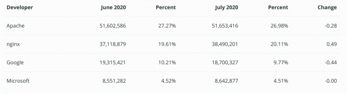 详情查看:https://news.netcraft.com/archives/2020/07/27/july-2020-web-server-survey.html