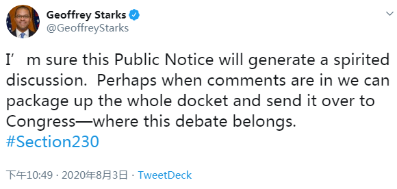 然而 FCC 民主党专员 Geoffrey Starks 还是在 Twitter 上表示,该采取行动的应该是国会,而不是 FCC:“或许我们可以将公众评论收集打包,然后提交给这场辩论本该所属的国会”。