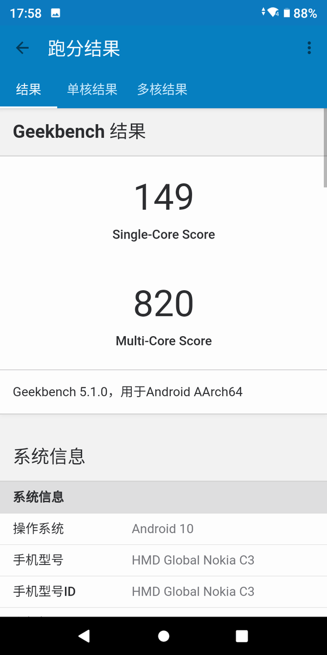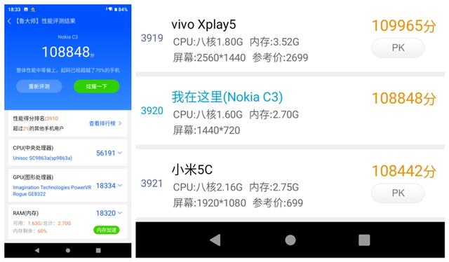 按照安兔兔的评价体系,Nokia C3的整体性能大致与骁龙450机型相近。这里安兔兔的评分结果和鲁大师一样,也显示其整体性能与小米5C相近。