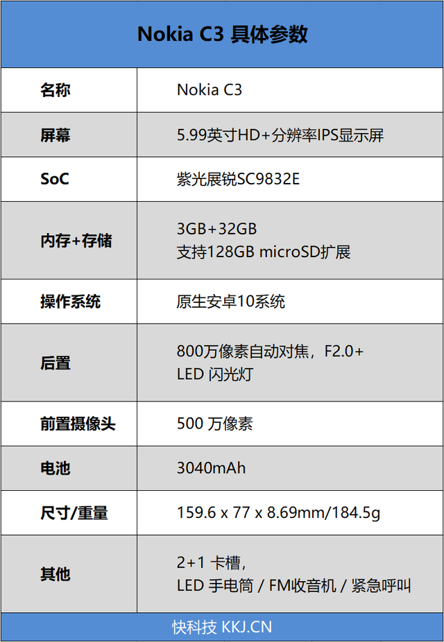 在开始今天的评测之前,我们先来了解一下Nokia C3的具体参数规格。