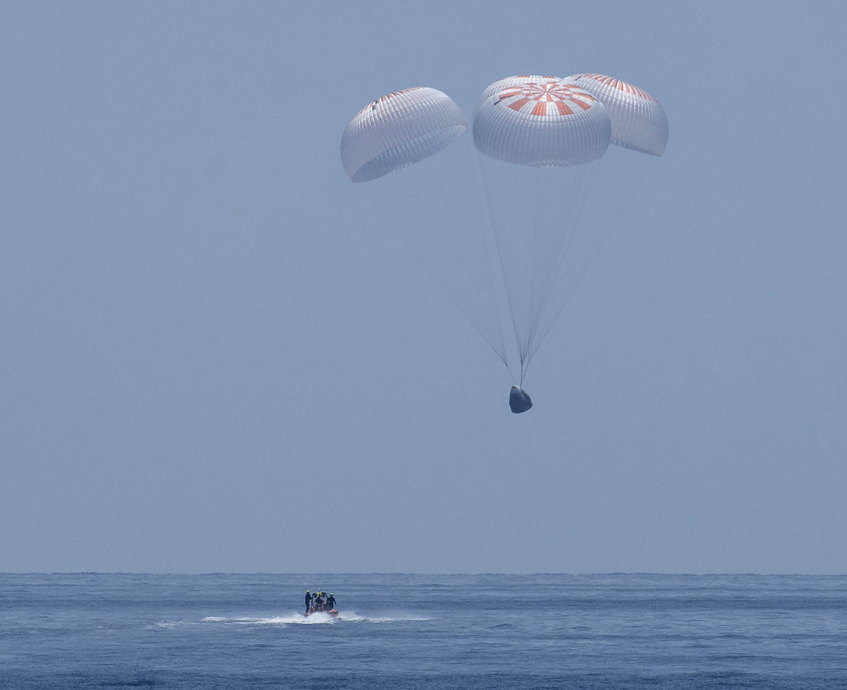 相反,这是一次戏剧性的下降--载人龙飞船穿越地球大气层冲向墨西哥湾。两套用来控制速度的降落伞最终也被收回。最后,美国东部时间周日下午2点48分,NASA的这段视频显示,其宇宙飞船溅落到了海洋。