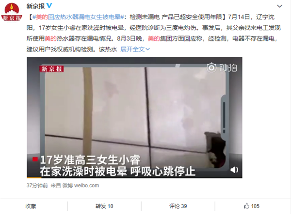 同时,美的方面表示,该热水器使用已超过10年,而根据行业标准,电热水器安全使用年限是8年,建议广大用户及时更换旧家电。