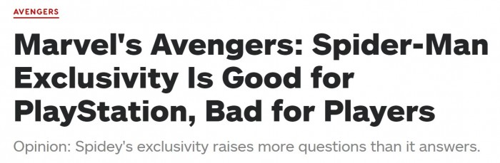而且SE还没有确认这次的独占角色是否限时独占,或者Xbox和PC会不会受到一些补偿作为平衡。接着,IGN就发表了一篇文章表示,索尼独占《漫威复仇者联盟》蜘蛛侠角色有利于自己不利于玩家。