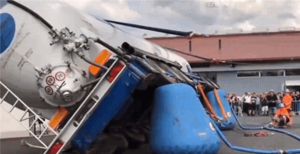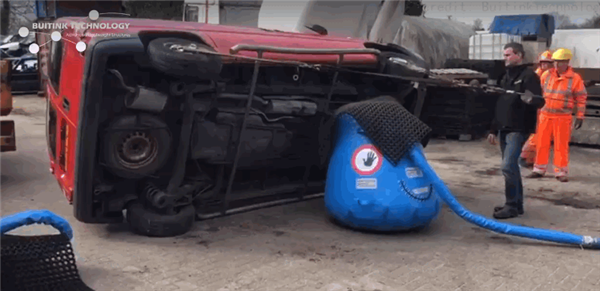 从网友上传的视频可以看出,该车祸处理着陆袋,放置在侧翻车辆的底盘下方,然后开始为着陆袋充气,为其充至合适的体积大小后。(视频点此观看)