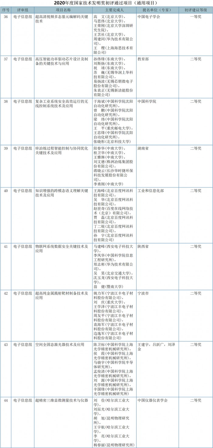 除此之外,在电子信息组评审组中,还有中国科学院提名的“复杂工业系统安全高效运行的无线控制系统技术及应用”,湖南省提名的“锌冶炼过程智能控制与协同优化关键技术及应用”,教育部提名的“高压智能功率驱动芯片设计及制备的关键技术与应用”,宁波市提名的“超高纯金属溅射靶材制备技术及应用”等也获得了2020年度国家技术发明奖二等奖。