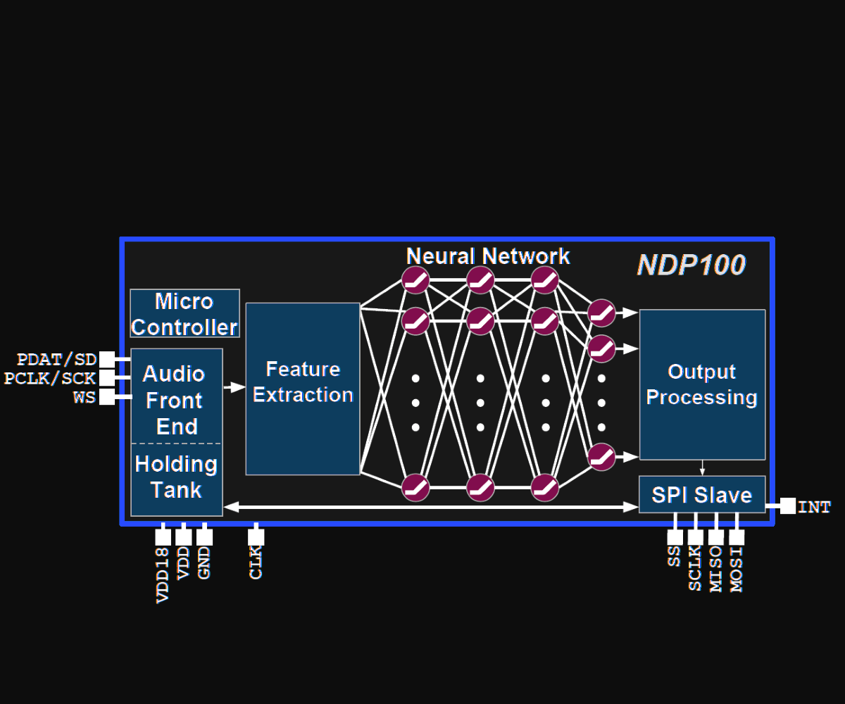 Syntiant的NPD100和NPD101处理器尺寸约为1.4毫米×1.8毫米,可运行具有50多万个参数的模型。这两款芯片包装了一个通用的ARM Cortex-M0处理器,搭配128KB内存,功耗不到140微瓦,并可实现板载固件安全和认证、关键字训练以及多达64种输出分类。