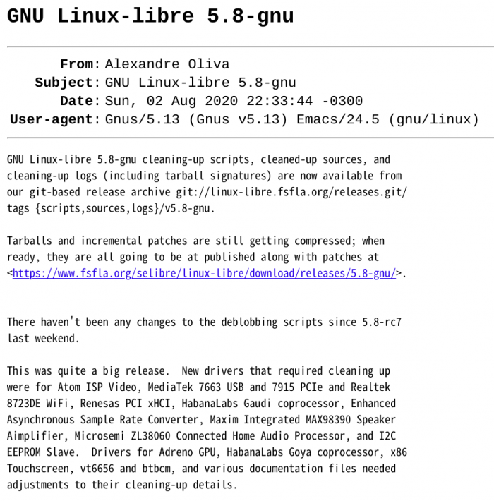 昨天 Linux Kernel 发布了 5.8 版本,自由软件基金会的拉美团队(FSFLA)照例跟进发布了 GNU Linux-libre 5.8 内核。GNU Linux-libre 项目致力于为那些遵循自由软件基金会的《GNU 自由操作系统发行版指南》(GNU Free System Distribution Guidelines)的人们提供上游 Linux 内核的 100% 自由版本。