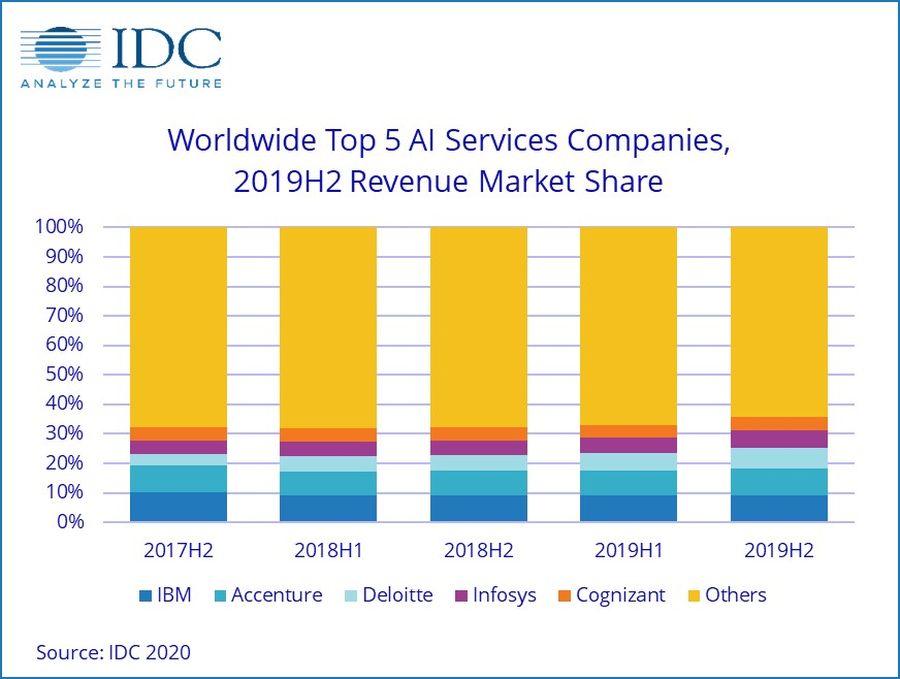 根据 IDC 的研究,软件构成了最大的人工智能技术群体,提供了 80% 的收入。在软件领域,人工智能应用带来了绝大部分的收入,而且 IDC 预计它将在 2020 年带来 1204 亿美元的收入。