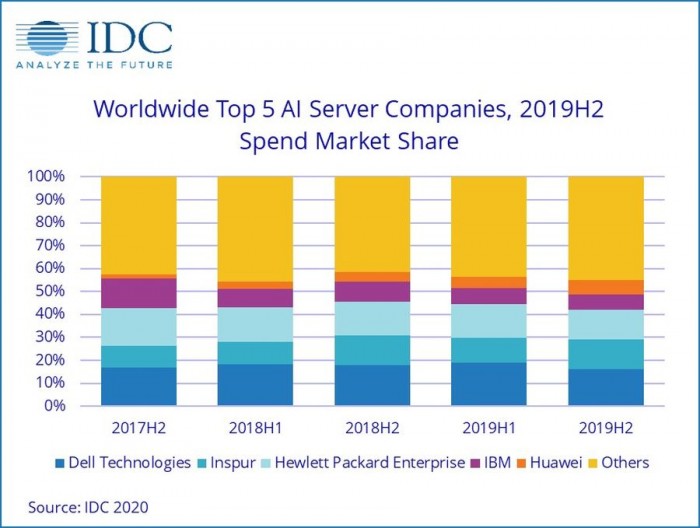 在AI硬件方面,IDC表示,2020年收入将达到134亿美元,同比增长10.3%。与软件类一样,这一增速较上一年增长33.4%有明显下降。该分析师表示,明年人工智能硬件应该会恢复强劲增长,同比增长35.5%。