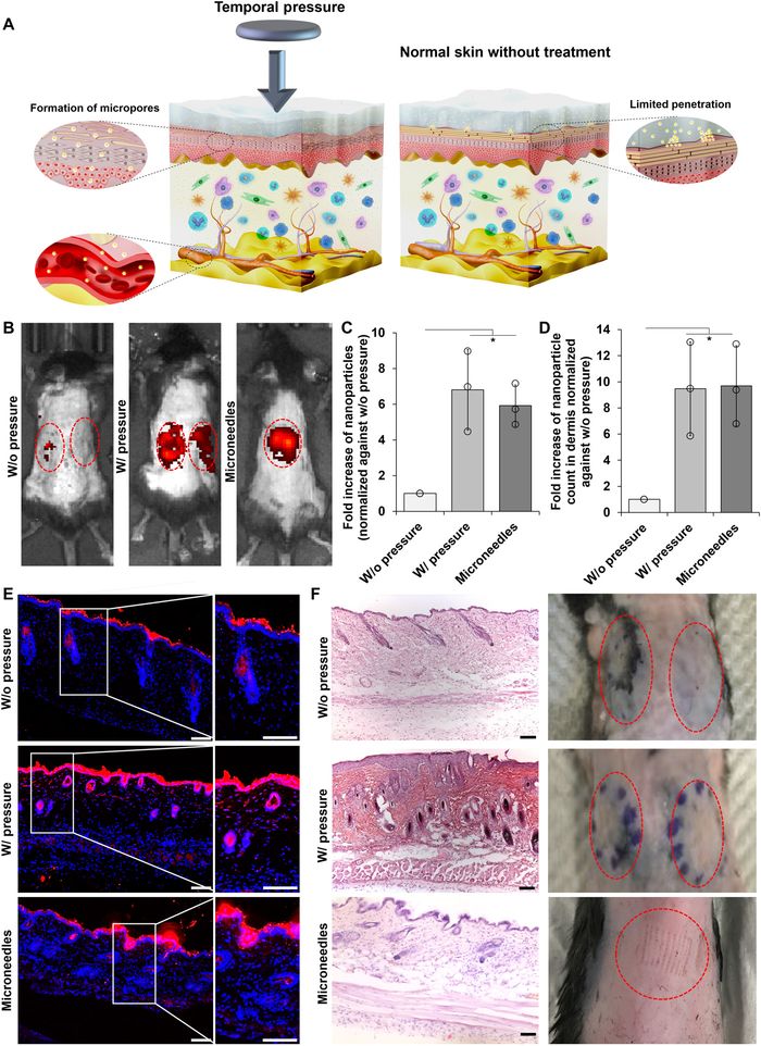 研究小组发现,额外的微孔,其特点是面积约为三微米,允许六倍质量的药物通过皮肤扩散相比,涉及无时间压力的治疗。输送的药物量也与通过微针贴片输送的药物量相当,而微孔被发现在一天后就消失了。