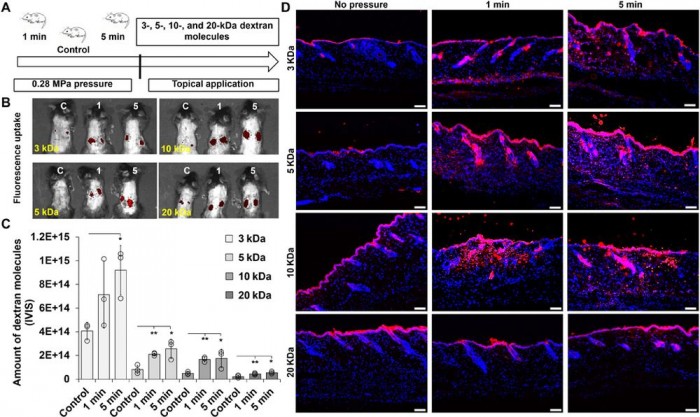 这项研究目前已经在小白鼠上进行,重点研究了在皮肤上通过“暂时性压力”的方法迫使皮肤屏障发生短期改变,从而让皮肤出现额外的微孔,从而使药物更容易进入体内并扩散。