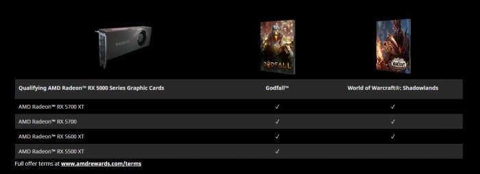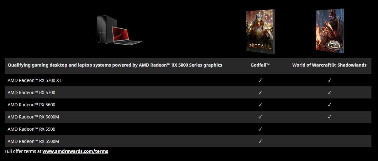 同时购买RX5000系显卡的台式整机和笔记本系列也可以获赠《众神陨落》和《魔兽世界》新资料片“暗影之地”,但是购买RX5500和RX5500XM的设备将不赠送《魔兽世界》新资料片“暗影之地”。