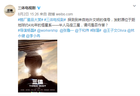 “探测到来自地外文明的信号,发射源位于距地球约4光年的恒星系——半人马座三星,请问是否作答?”近日,在腾讯视频举行的年度发布会上,由科幻小说《三体》改编的同名电视剧官宣阵容,并发布概念海报。