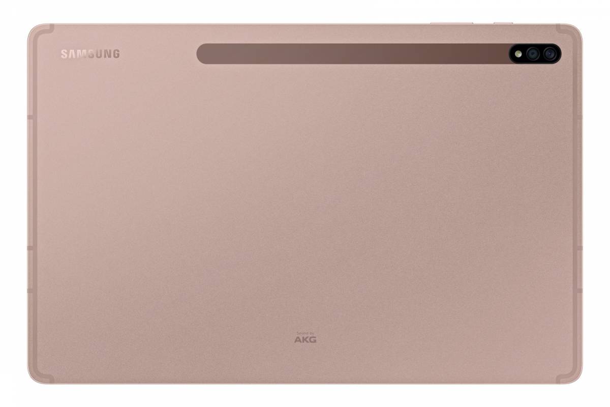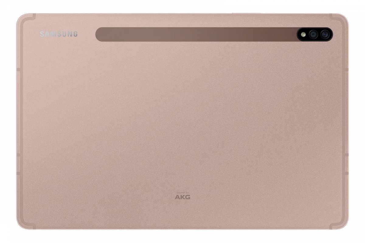 USB 3.2 Gen 1 Type-C是三星Galaxy Tab S7系列平板的标准配置,其中支持DisplayPort输出,指纹传感器内置在侧面的一个按钮中,而Galaxy Tab S7+则将其换成了显示屏内的指纹识别器。两者都有四个AKG扬声器,并支持杜比Atmos。背面有一个1300万像素的主摄像头、一个500万像素的超广角摄像头以及一个LED闪光灯;正面则是一个800万像素的摄像头。