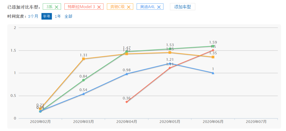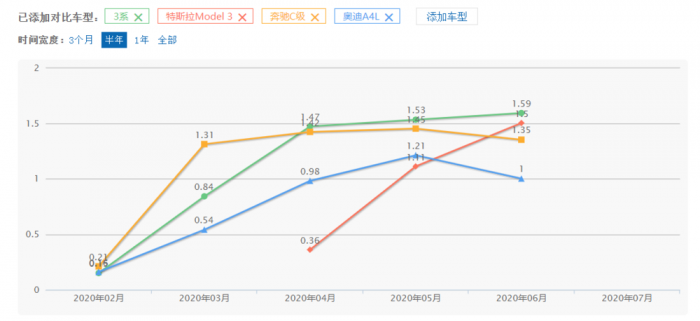 这个 “1.49 万辆”是个什么概念?Model 3 所在的豪华中型车细分市场,来华耕耘多年的三位老江湖奥迪 A4L、宝马 3 系、奔驰 C 级,各自月销量一般可以稳定在 1 万辆出头,1.5 万辆左右绝对算是优秀表现,通常只会出现在每代车型的寿命中期(产品力还够,同时又有了较大优惠)。