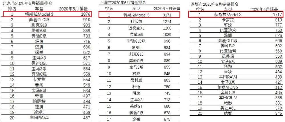 李想此番感慨,源于北京、上海、深圳三城 6 月汽车销量排名。Model 3 单月 1.49 万辆的全国销量,在北上深,优势再度被放大:Model 3 在三城都卖到了销量榜第一,且相比身后第二名都有超一倍的压倒性优势。