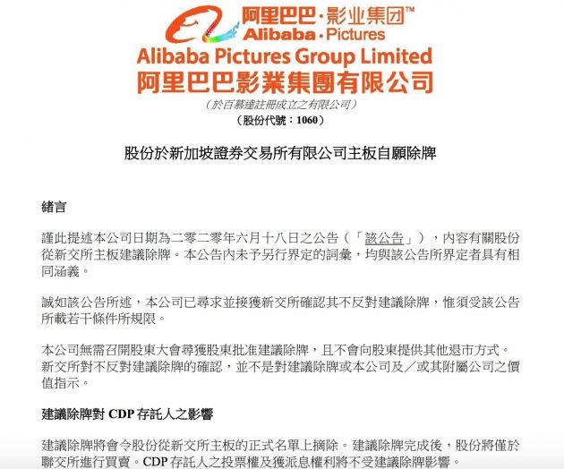 8月6日消息,阿里影业发布公告称,股份于新加坡证券交易所有限公司主板自愿除牌,除牌日期为十二月四日。至于摘牌原因,阿里影业对外表示,公司寻求建议除牌是基于策略性资源集合,保留在联交所的单一第一上市地位,可令公司集中资源发展中国业务,并有机会提高在联交所的股份成交量。同时简化合规责任,减除与新交所规定相关的行政开支及合规责任,可降低法务风险及合规成本。