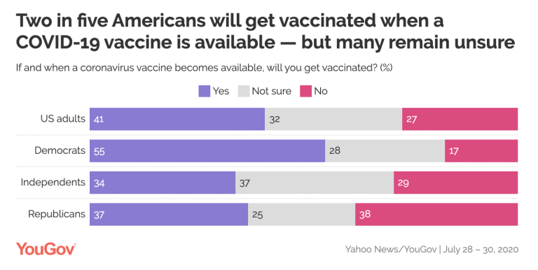 在7月初,这个数字已经下降至46%。而现在,在7月28日至30日进行的雅虎新闻/YouGov最新民调中,只有41%的美国人表示计划接种新冠疫苗,这是迄今为止这项民调获得的最小份额。