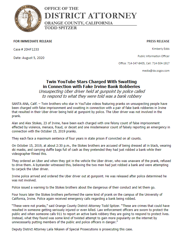 “这些不是恶作剧。这些都是可能导致某人严重受伤甚至死亡的罪行,”奥兰治县地方检察官托德-斯皮策在一份声明中说。“执法人员宣誓保护公众,当有人拨打911报告一起正在进行的银行抢劫案时,他们会做出反应以保护生命。相反,他们发现的是某种扭曲的企图,通过不必要地将公众和警察置于危险之中,在互联网上获得更多的人气。”