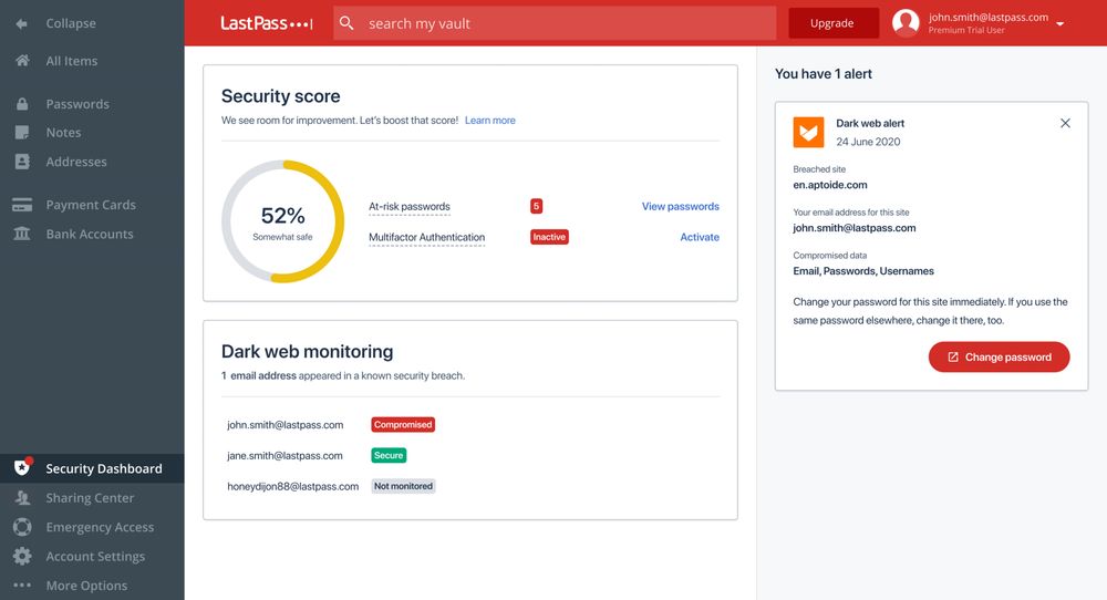 知名密码管理器 LastPass 今天宣布了全新的“Security Dashboard”,帮助用户更好管理密码和账号的安全性及完整性。该功能适用于该服务的所有用户,不过更多的暗网监控选项仅限于 Premium, Families 和 B usiness 用户。