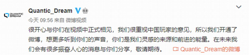 很开心与你们在视频中正式相见,我们很重视中国玩家的意见,所以我们开通了微博,想更多听到你们的声音,你们是我们灵感的来源和前进的能量。在未来我们会有很多振奋人心的消息与你们分享,敬请期待。
