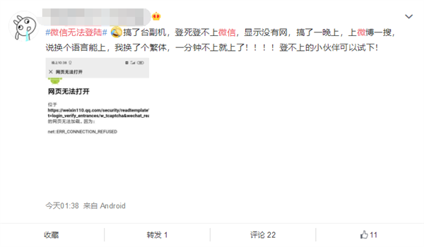 8月6日消息,有不少网友反映称微信出现无法登录的状况,输入短信和密码验证后,显示“无法打开页面”,更换手机也无法登录。从网友的评论来看,更改微信的语言的方法有的有效,有的依然无法登录。目前,微信官方尚未回应。