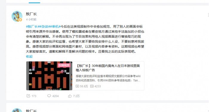 今日(8月6日)敖厂长发布“30年前国内竟有人在日本游戏里面植入恰饭广告”视频,并发文道歉:今后在这类视频制作中会愈加规范,用了别人的画面会标明引用来源并作出感谢。使用了模拟器或者在哪些地方通过其他手法施加的小招也会有清楚的解释。不会再出现为了节目效果利用他人视频画面进行替换取巧的现象。感谢大家的批评和监督,也希望大家不要给我安排什么人设,不要刻意将我拔高。感恩视频部分画面和网络图片素材,以及视频内容参考资料。这期视频也希望大家能够喜欢。道歉和解释不是解决问题的根本。且看我之后的实际表现吧。