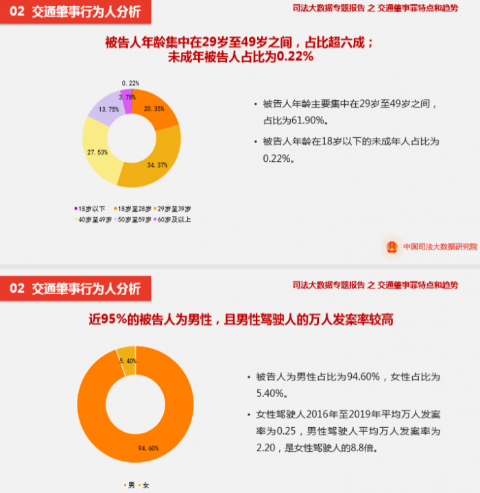8月6日,据媒体报道,中国司法大数据研究院发布的《交通肇事罪特点和趋势(2016.1-2019.12)司法大数据专题报告》显示,交通肇事行为人分析数据显示,被告人为男性占比为94.60%,女性占比为5.40%。
