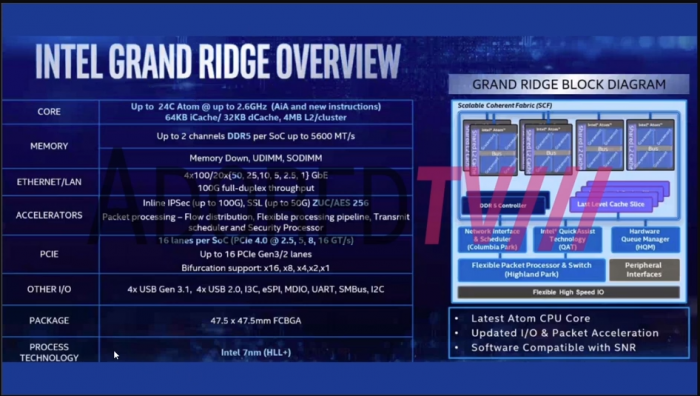 早在2019年初的CES大展上,Intel就宣布了基于10nm工艺、面向5G无线基站的Snow Ridge SoC处理器,直到今年2月底才正式发布,定名凌动Atom P5900,但没有公布具体规格。根据最新消息,Snow Ridge的继任者代号为“Grand Ridge”,而这次,详细的规格参数提前一览无余。