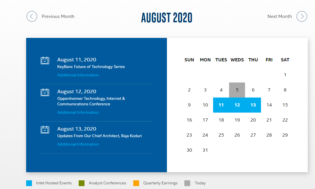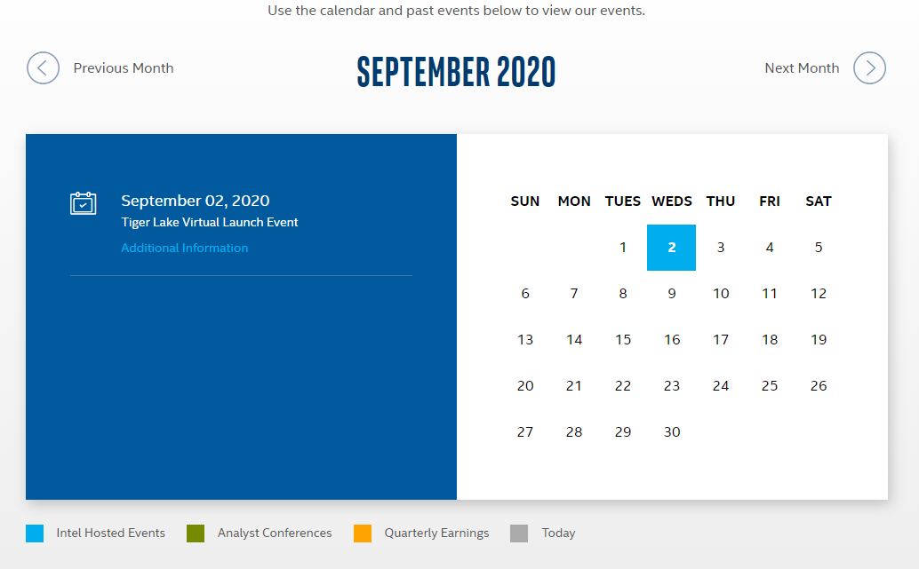 上个月,英特尔透露计划在9月2日进行下个月的“大动作”,尽管具体产品是什么的线索很少。不过,现在,该公司已经(也许是偶然地)确认将在当天举办一次Tiger Lake发行活动,这要归功于该公司为投资者准备的日历上的列表,该列表首先由Twitter用户SteakisGood发现。