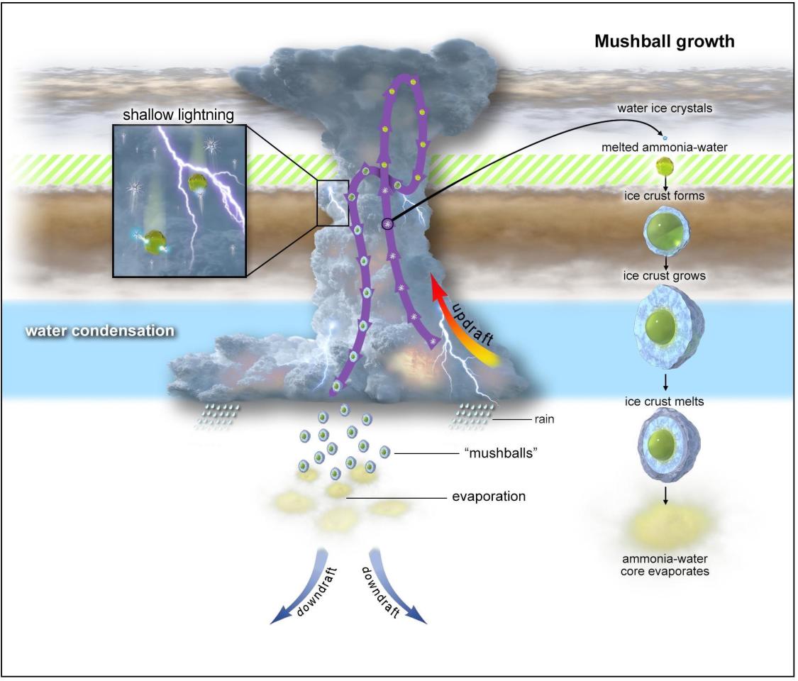 从那时起,人们就认为木星的闪电与地球的闪电类似,只在雷雨中发生,而水在雷雨中的所有阶段都存在。在木星的大气层中,这将把风暴置于可见云层之下约28到40英里处,温度约为华氏32度。然而,闪电曾被观察到是云层顶部的亮点。新的发现表明,雷暴可以将水冰晶体高高抛入行星大气层,在木星水云上方16英里以上,在那里遇到大气中的氨气,使冰融化形成新的氨水溶液。在这些高海拔地区,温度低于华氏零下126度,太冷了,液态水不可能存在。