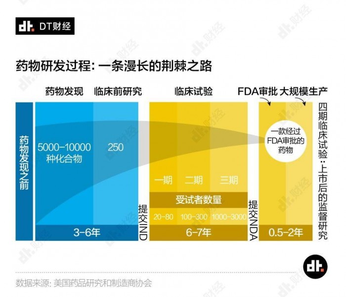 《DT财经》曾将一款药物从实验室研究到最后成功上市销售要经历的流程大致总结为:前期研究→发现候选药物→临床前研究→临床试验→新药申请→批准上市。