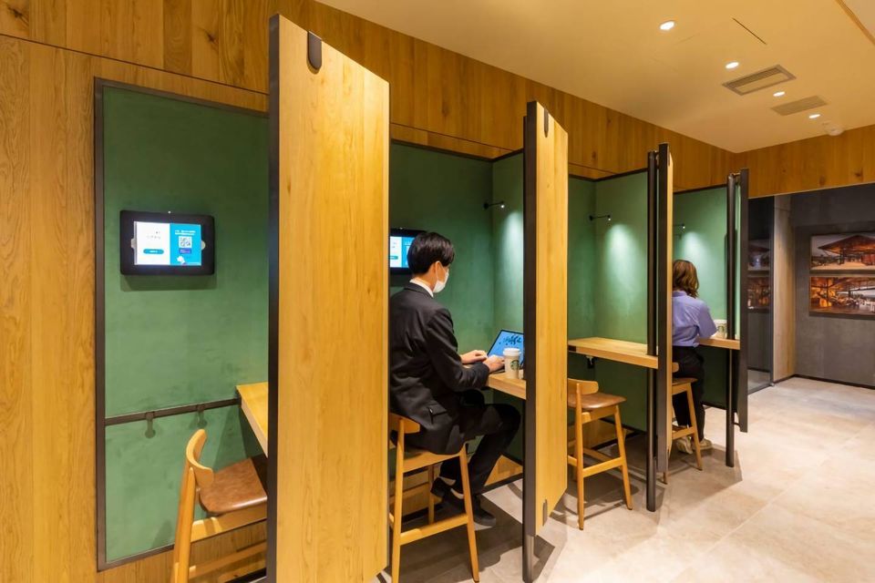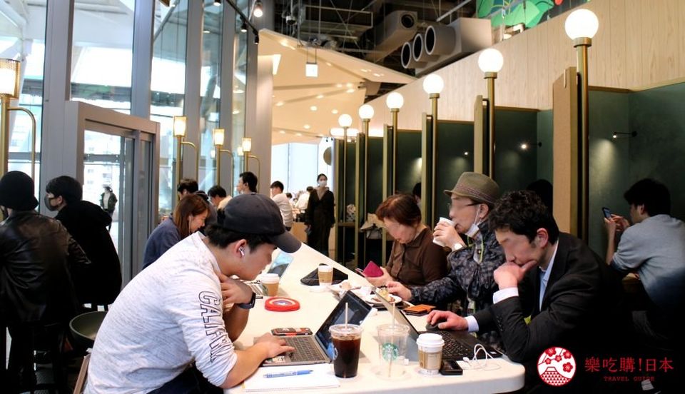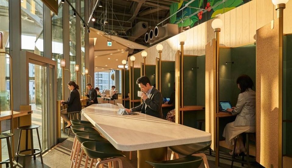 去星巴克,不少人都是用一杯香浓的咖啡和甜点来享受惬意的闲暇时光,但也有不少人是为了洽谈业务或者是为了完成手头上的工作。为了这些职场人员,星巴克已经提供了咖啡、笔记本电脑吧台和大量的电源插座,不过在日本新开的星巴克则更进一步,打造成一个联合办公空间。