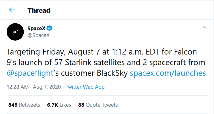 这次星链计划的发射行动预计将于美国东部时间8月7日星期五上午1:12(太平洋时区8月6日晚上10:12)在佛罗里达州肯尼迪航天中心实施。另外,行动还在8月8日星期六美国东部时间上午12:50(美国东部时间8月7日晚间9:50)设置了一个备选发射时间点。