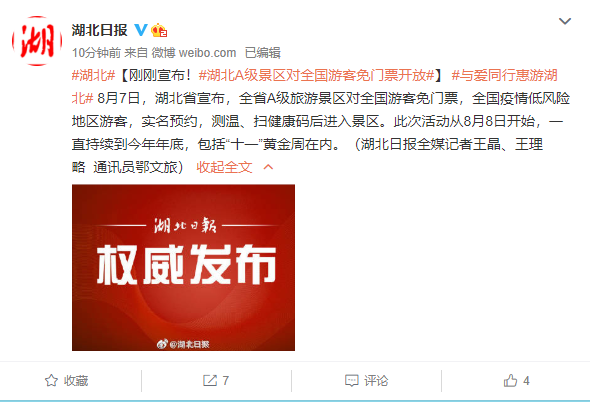 综合国内媒体报道,8月7日,湖北省宣布,全省近400家A级旅游景区对全国游客免门票。全国疫情低风险地区游客,实名预约,测温、扫健康码后进入景区。旅行社组团游客,同样也可以享受这个政策。此次活动从8月8日开始,一直持续到今年年底,包括“十一”黄金周在内。