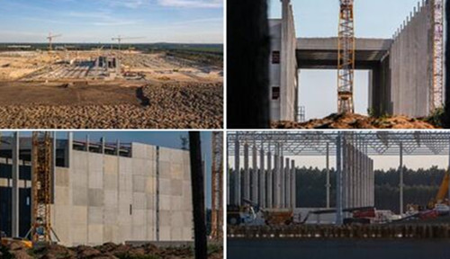 特斯拉在柏林建设超级工厂,是由其CEO马斯克去年11月份在柏林的一次颁奖典礼上宣布的,随后确定建在柏林近郊勃兰登堡州的格伦黑德。很快就开始了场地上森林的清理、土地平整,随后开始进行基础施工,混凝土柱、混凝土板等各种预制件也逐步运抵工厂。