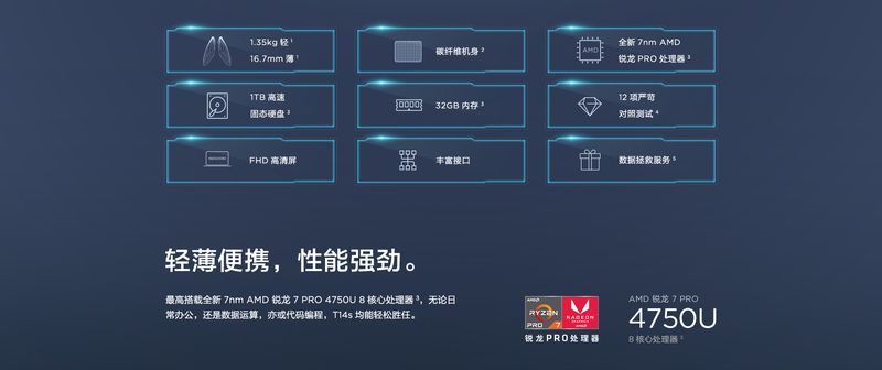 ThinkPad T14s 锐龙版工程师系列主打轻薄高能,即使在严酷的环境下也能为用户提供稳定可靠的用户体验。该机搭载了全新的 7nm 工艺的锐龙 7 Pro 4750U 八核处理器,能够轻松胜任日常办公、数据运算、代码编程。