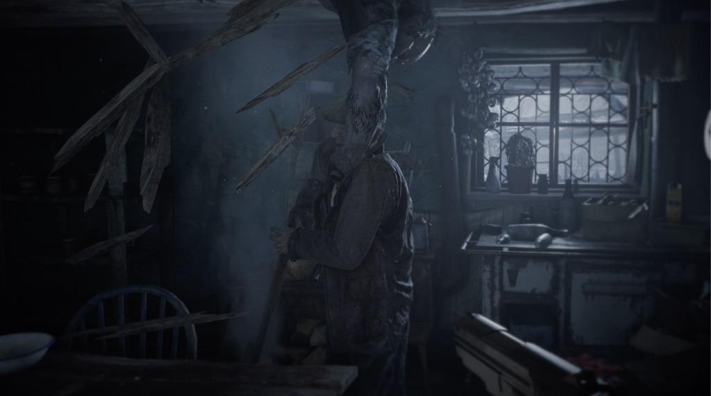 游戏序幕是伊森和妻子米娅,女儿罗斯(Rose)在一个村庄里平静地生活,玩家操控伊森在屋中走动,能发现一些笔记,里面提到他们这家人已经治愈了E系列霉菌感染。但好景不长,克里斯·雷德菲尔德带着两名蒙面男子闯入他家中,导致米娅被射,孩子被克里斯抢走,伊森也被塞入车中带走。之后出现车祸,伊森爬出车辆寻求帮助。随后伊森进入一个小屋,发现有个老人躲在屋内。他们开始交谈,但随后老人被神秘怪物杀死。周围又出现了许多兽人,伊森为保命开始逃窜。
