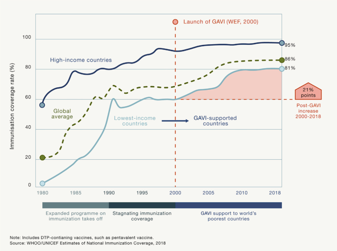 一直以来,Gavi致力于促进贫困国家的疫苗免疫工作。2000年时Gavi尚未成立,低收入国家的疫苗普及率是59%,而高收入国家是90%,两者有31%的差距。而到2020年,Gavi成立18年以后,低收入国家的疫苗普及率已经提升到81%,高收入国家是95%,两者只有14%的差距。而仅在2019年一年就有6500万贫困儿童在Gavi的支持下获得疫苗接种。