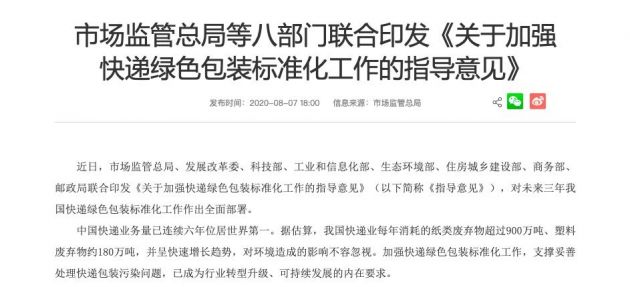 8月8日消息,日前,市场监管总局、发展改革委、科技部、工业和信息化部、生态环境部、住房城乡建设部、商务部及邮政局发布关于加强快递绿色包装标准化工作的指导意见,意见明确,力争到2022年,全面建立严格有约束力的快递绿色包装标准体系,逐步完善标准与法律政策协调配套的快递绿色包装治理体系,推动标准成为快递绿色包装的“硬约束”,支撑快递包装减量化、绿色化、可循环取得显著成效。