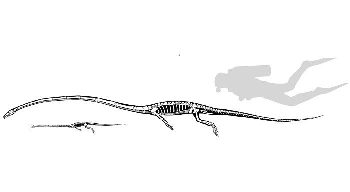 外媒报道称,研究人员刚刚拼出了一种骨骼体长令人难以置信的“古蜥蜴”(Tanystropheus hydroides)。其颈部长度几乎占据了整个身体的一半,或许会为该物种带来一些意想不到的好处。研究人员指出,Tanystropheus hydroides 可能生活在水中、并在岸边猎杀食物,或者利用灵活的长颈来捕鱼。
