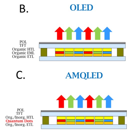 最后就是QLED的最终形态,也是真正的QLED,那就是AMQLED(Active-Matrix Quantum dot Light Emitting Diodes),因为上面的两个阶段量子点都需要借助光能来实现色彩。