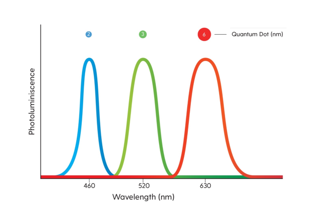 至于发出哪种颜色的光则是由量子点本身的大小决定的。一般来说,6nm的量子点由于能带间隙较小,只需要少量能量就可以使电子脱离原子,其产生的波长也会因而会较长,因此会发出红光;2nm的量子点则是相反,能带间隙较大,因此波长会较短,产生的是蓝光;而处位两者之间大小的3-4nm量子点则会发出绿光。
