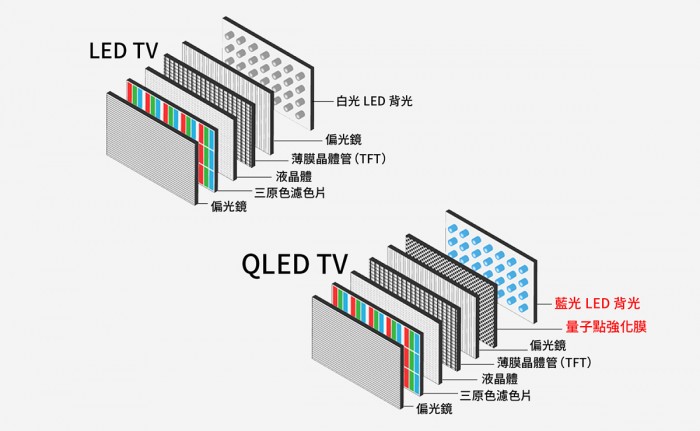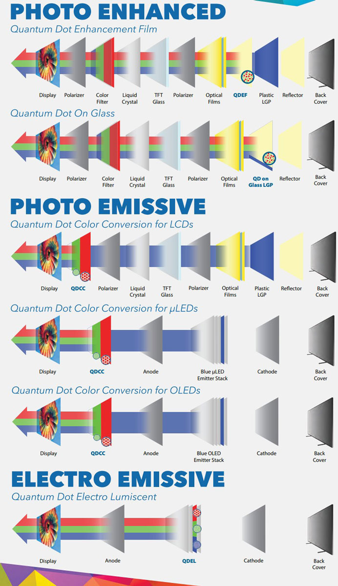 因此各QLED厂家在这个阶段的做法就是在LED背光源前加上一层量子点强化膜,然后通过LED背光来给膜上的量子点拖加能量,让它们呈现出红绿色彩。
