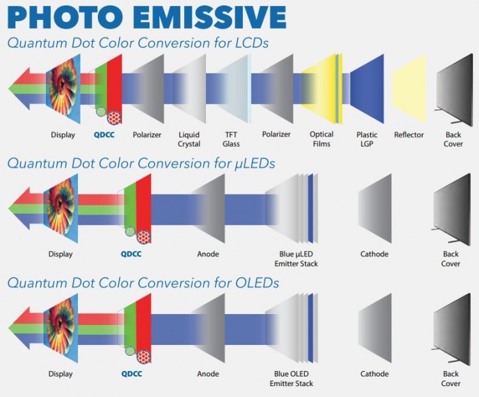 而这项技术不仅仅可以应用在LED屏幕上,这也是为什么笔者上面会说蓝光光源而非背光源的原因,因为像OLED以及或是许会在不久后到来的Micro LED这些自发光的光源也可以用来为量子点色滤光片提供光能,也就是QD-OLED以及QD-Micro LED。