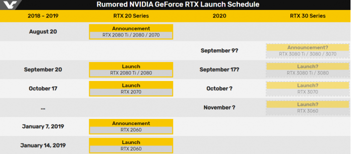 VC网站也根据之前的图灵显卡的发布时间做了一个对比,后者是2018年8月20日发布、9月20日正式上市的,首发的是RTX 2080 Ti和RTX 2080显卡,3个月后才推出了RTX 2060显卡。